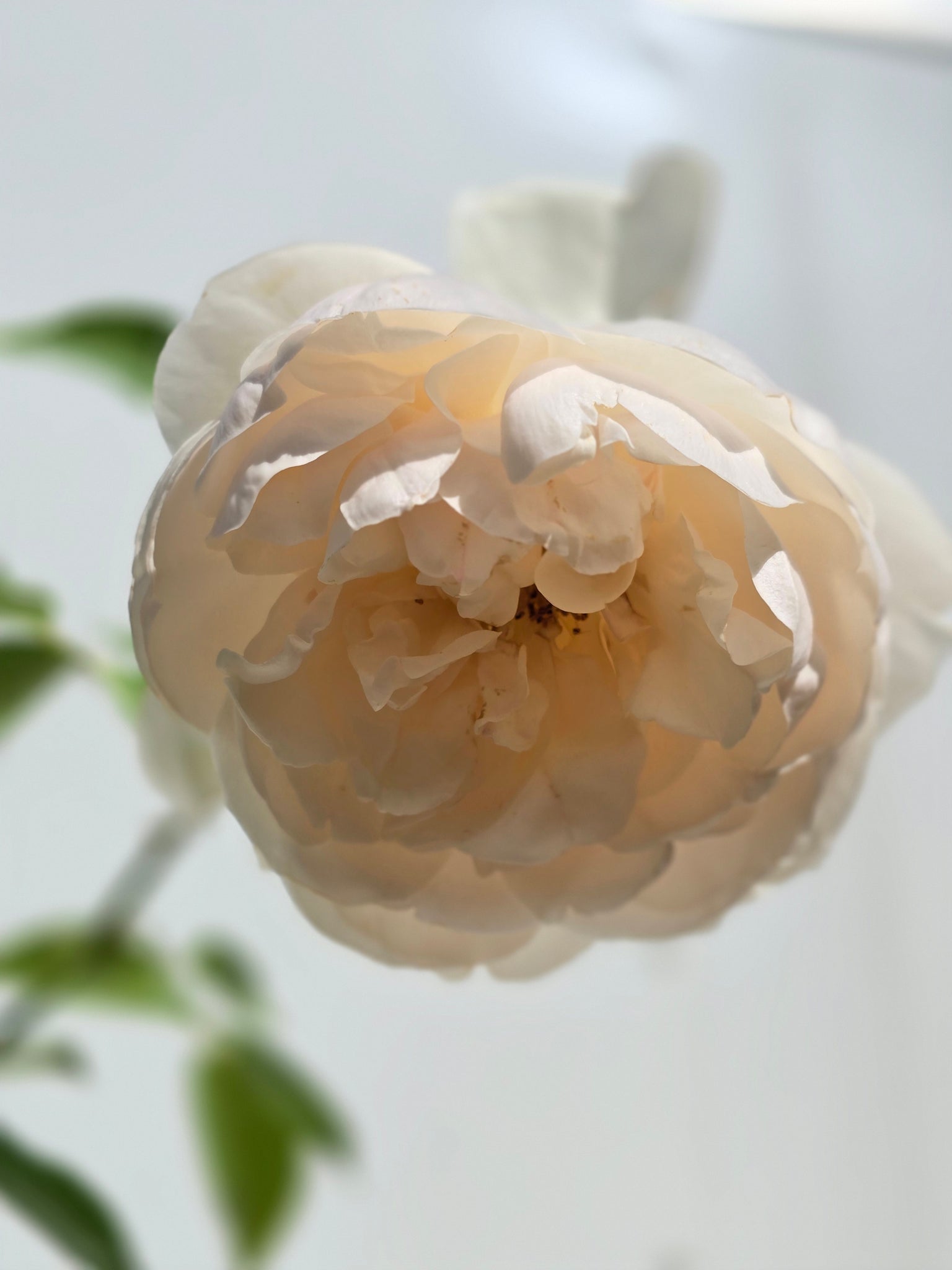 Desdemona opens with peachy pink buds that gracefully reveal beautiful, chalice-shaped blooms in a white hue, tinged with a soft pink blush. These unique, incurved petals create a captivating interplay of light and shadow.