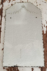This antique beveled pie crust mirror is a must-have for any vintage lover. The rare frameless pie crust edging adds a unique touch to this piece, along with the etched floral design and beveled glass. Whether you're looking to add character to your gallery wall or create a stunning display on a shelf, this mirror is the perfect addition. Its age adds to its charm and makes it a true antique treasure. Measuring at 18 inches, it's the perfect size to make a statement in any room. Don't miss out on this one-of-a-kind piece from Vintage Character.