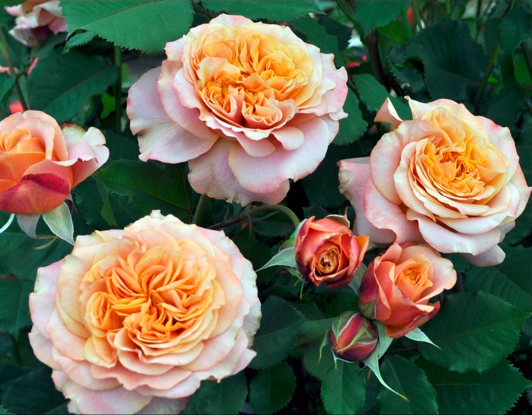 Exciting four-inch, copper-yellow blooms are displayed on a robust, healthy shrub. Abundant foliage is glossy and dark green. This rose has a strong repeat bloom for season long enjoyment.